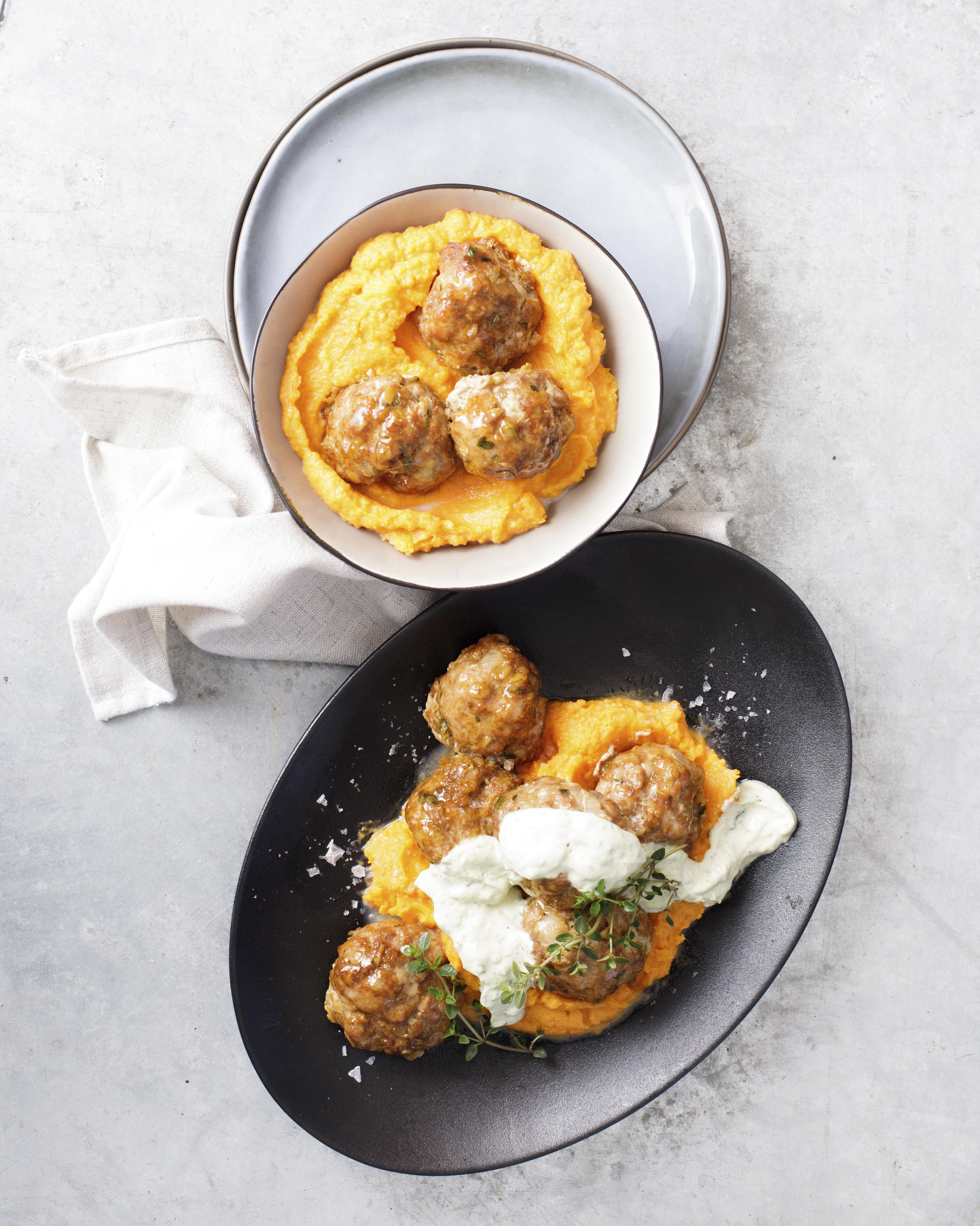 6 To serve: Spoon the purée on a plate and arrange the meatballs on top. Serve with the pesto yoghurt sauce.